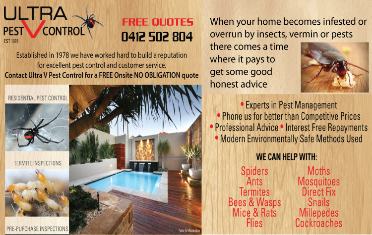 Ultra V Pest Control is an expert in Pest Management – Phone us for better than Competitive Prices – Professional Advice – Interest Free Repayments – Modern Environmentally Safe Methods Used
