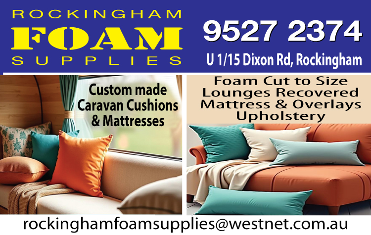 Rockingham Foam Supplies has been servicing the Rockingham Kwinana area for many years, offering a first class service in all types of upholstery. Neville and his staff can assist with advice on the right colour and fabric for your job. He has a huge range of more than 150 colours and quality fabrics. Services Include Cushions, Lounge Suites, Dining Chairs Re-covered, Boats & Caravans, Mattresses & Overlays, Polystyrene Sheets, Foam Cut to Size & Upholstery Supplies